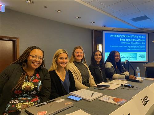 Featuring the development of the Student Advisory Committee (SAC) and the board’s Student Ambassadors, the presentation provided a timeline review and function of the student roles. Several students were part of the panel, including current student ambassadors to the board Aanya Roy (OE) and Kaitlyn Jobes (OH), along with Monica Lopez (OE), SAC committee member, and Arriyana Franklin (OH), alumni SAC member. Students shared with attendees the importance of collecting the opinions of students and sharing them at the board level. The presentation focused on the importance of talking with students, not just about them. Board-level decisions are often made without the consideration of input from the students who are directly impacted. Having this type of conduit between district leaders, the Board of Education, and the students they serve is critical for decisions to be appropriate and relevant to students.