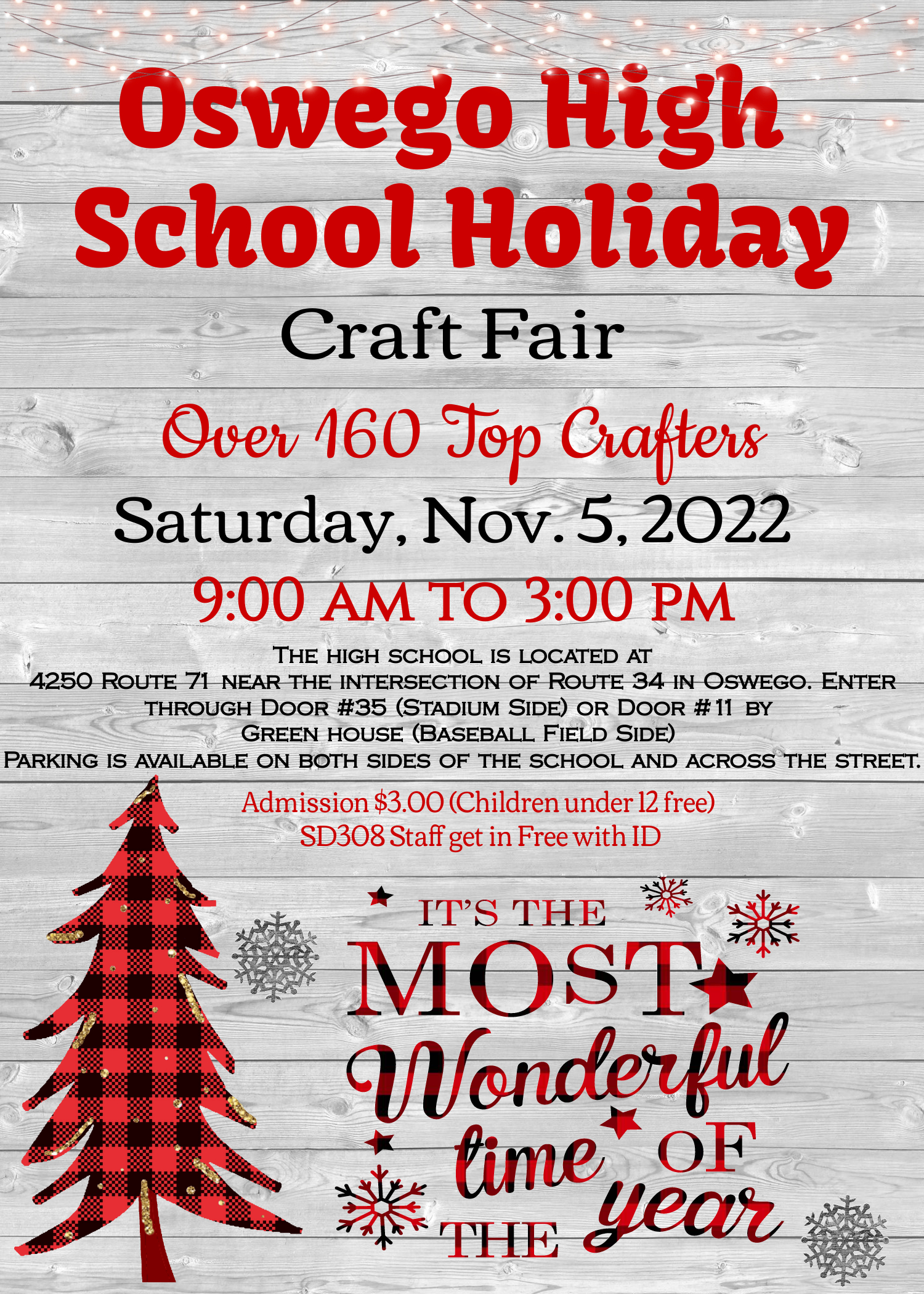Oswego High School Holiday Craft Fair - Saturday, November 5 (9-3:00pm). Over 160 top crafters; admission is $3.00 (children under 12 free); SD 308 staff get in FREE with ID! Click here to view the OHS Holiday Craft Fair Flyer.